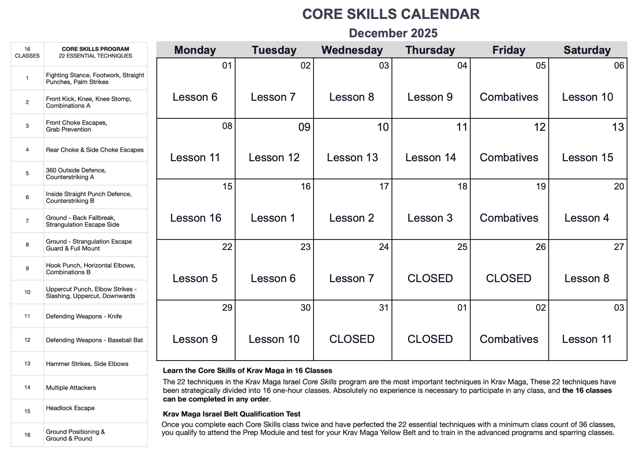 The Core Skills Program is unique, offering a structured and comprehensive approach to Krav Maga training. Over the course of 16 one-hour classes, you'll learn the 22 core techniques of Krav Maga. These techniques are divided into specific lessons, each focusing on a different aspect of Krav Maga, from striking and blocking to self-defence and ground techniques.